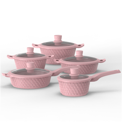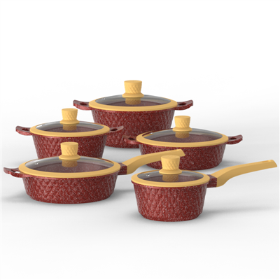 Az egyrészes présöntött 10-darabos készlet, amely egy 16 cm-es tejesfazékból, 20 cm-es leveses fazékból, 24 cm-es levesesfazékból, 28 cm-es sekély leveses fazékból és egy 28 cm-es, fedett serpenyőből áll, a leggyakoribb és klasszikus kombináció. soha nem hibázhat egyetlen konyhában sem. A belseje tapadásmentes márvány bevonattal, míg a külseje ugyanazzal a magas hőmérsékletű márványfestékkel van bevonva. A szilikon anyag megvédi az üvegfedelet a könnyű sérüléstől, az indukciós fenék pedig különféle alkalmakra alkalmas, beleértve az indukciós tűzhelyeken való használatra is. Az általános dizájn feltűnő színkombinációt tartalmaz, amely egyedi és szemet gyönyörködtető jelenlétet biztosít bármely konyhában.