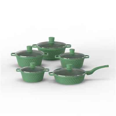 A legújabb 10-részes fröccsöntött készlet klasszikus kombináció, amely a legtöbb főzési igényt kielégíti. Négy fazekát és egy mély serpenyőt tartalmaz. A belső tapadásmentes bevonat megakadályozza az élelmiszerek megtapadását, míg a speciális rombusz alakú külső egyedi megjelenést kölcsönöz neki. Még a színt is testreszabhatja, és kiválaszthatja a kívánt bevonatmárkát. Ez az edénykészlet alkalmas gáztűzhelyekhez, és kompatibilis az indukciós tűzhellyel is, így számos beállításhoz tökéletes.